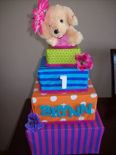 Directions: Fill boxes with gifts or tokens/prizes. Then, wrap fabric around boxes, secure with ribbons, or fabric (or strong) tape. Stack boxes and decorate with toys around, or ribbons on fabric, etc. Stack boxes to give the look of a tiered cake. Have fun with it!